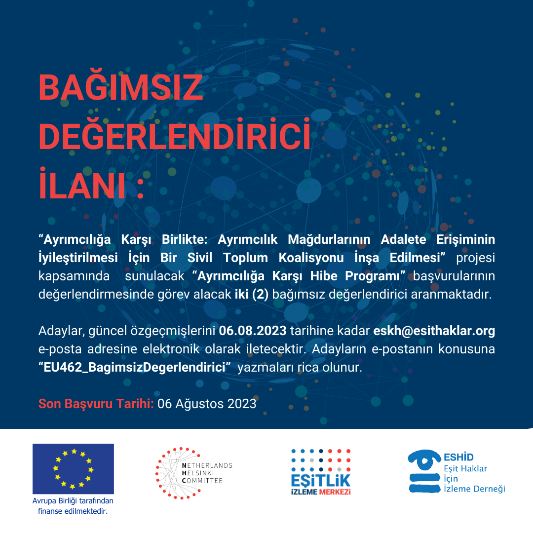 Eşit Haklar İçin İzleme Derneği (ESHİD) ve Hollanda Helsinki Komitesi (NHC), AB tarafından finanse edilen, demokrasi, insan hakları ve temel özgürlüklerin korunması ve geliştirilmesinde sivil toplumu desteklenmesine katkıda bulunmayı amaçlayan “Ayrımcılığa Karşı Birlikte: Ayrımcılık Mağdurlarının Adalete Erişiminin İyileştirilmesi İçin Bir Sivil Toplum Koalisyonu İnşa Edilmesi” projesi kapsamında bir alt hibe programı başlatıyor. Bu çağrı alt hibe programı kapsamında tasarlanan “Ayrımcılığa Karşı Hibe Programı” kapsamında yapılacak başvurular için bağımsız değerlendiriciler için hazırlanmıştır.